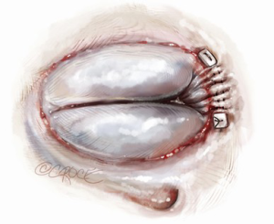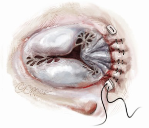The right atrium and the repaired valve are inspected once again. The properly performed annuloplasty gives the repaired valve a bicuspid appearance. The right atrium is then closed and cardiopulmonary bypass is weaned in a standard fashion.