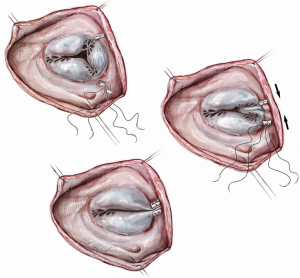 The midpoints of the TV leaflets are stitched together, originally described without (15) but can be done with pledgets (5). This produces a triple orifice ‘clover’ repair, which was supplemented with an annuloplasty ring, if not performed already (Figure 4).