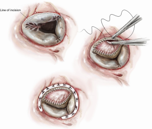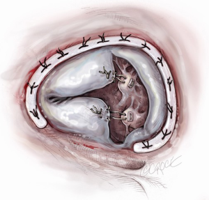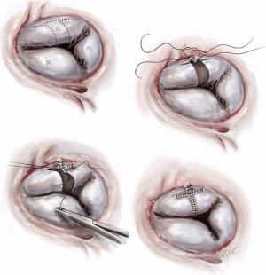 A curvilinear incision is made along the base of the anterior leaflet between antero-septal and antero-posterior commissures. The width and length of the deficit created is measured with the edge of the anterior leaflet, under enough traction to meet the septal annulus. A patch of autologous pericardium (bathed in glutaraldehyde for 10 minutes) is cut to measure the width + 0.5 cm and length + 0.5 cm. The patch is then sewn into the anterior leaflet defect with 5-0 polypropylene suture. A saline pressure test is used to test elimination of the antero-septal malcoaptation. An annuloplasty ring is placed to improve coaptation and prevent annular dilatation (Figure 3) (13,14).