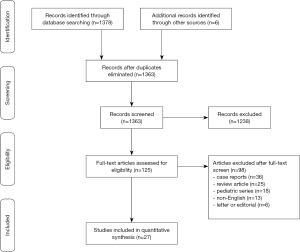 - Liberati A, Altman DG, Tetzlaff J, et al. The PRISMA statement for reporting systematic reviews and meta-analyses of studies that evaluate healthcare interventions: explanation and elaboration. BMJ 2009;339:b2700. [Crossref] [PubMed]