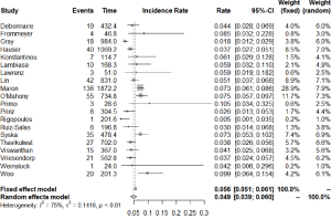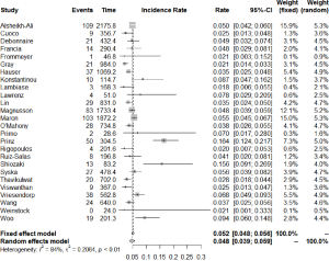 A meta-analysis of incidence rates was conducted for the available main perioperative and postoperative variables. Annualized incidence rates for appropriate, inappropriate shocks, as well as complications, were determined using the metarate function for total events per person years. Heterogeneity was evaluated using Cochran Q and I2 test. All analyses were performed using the meta-package for R version 3.3. P values <0.05 were considered statistically significant.