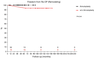 Descriptive statistics are presented as mean ± standard deviation. Time-dependent data on survival, reoperation and recurrent AR were analyzed using the Kaplan-Meier method. Group comparisons were performed using log-rank test. The significance level was set at P<0.05. Differences between continuous variables were compared by Student’s t-test or by Welch’s t-test in case of inhomogeneous variances. Categorical data were compared using chi-square test. All data were analyzed using statistical package SPSS version 20 (SPSS Inc., Chicago, IL, USA), Kaplan-Meier curves were computed using a commercial available program (Prism, GraphPad Inc., San Diego, CA, USA).