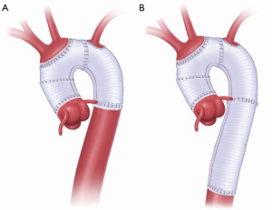 - Schoenhoff FS, Kadner A, Czerny M, et al. Should aortic arch replacement be performed during initial surgery for aortic root aneurysm in patients with Marfan syndrome? Eur J Cardiothorac Surg 2013;44:346-51; discussion 51. [Crossref] [PubMed]
