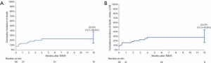 In 2015, a global feasibility study of the Medtronic IntrepidTM system was initiated with recruitment from 14 hospitals in Australia, Europe, and the United States (5). For this study, patients with symptomatic, severe MR who were at high or prohibitive surgical risk were considered for enrolment, with primary exclusion criteria being an ejection fraction <20%, mitral valve calcification, hemodynamic instability, severe pulmonary hypertension, severe renal insufficiency and prior mitral valve surgery or intervention. The results of the initial 50 patients (mean age, 72.6±9.4 years; 58% men; Table 1) who were consecutively enrolled through July 2017 have been published. Severe heart failure was common, with NYHA III or IV symptoms present in 86%. The predominant mechanism of MR was secondary (84% of patients). The mean left ventricular ejection fraction at baseline was 43.4%±11.8% (range, 20–70%). Overall, the population was at significantly increased risk of open surgery with an average STS-PROM of 6.4%±5.5% and a EuroSCORE II of 7.9%±6.2%. Successful implantation of the Intrepid valve occurred in 48 of 49 attempted patients (98.0%), with a median procedure time of 100 minutes [interquartile range (IQR), 80, 124] and a median time for device deployment of only 14 minutes (IQR, 12, 17). One malpositioning of the Intrepid valve occurred. There were no incidences of device malfunction or LVOT obstruction and no patient required conversion to open cardiac surgery. Seven deaths occurred within 30 days, with three as a result of apical access site bleeding, three as a result of refractory heart failure and one in the patient with malposition (Table 2).