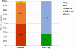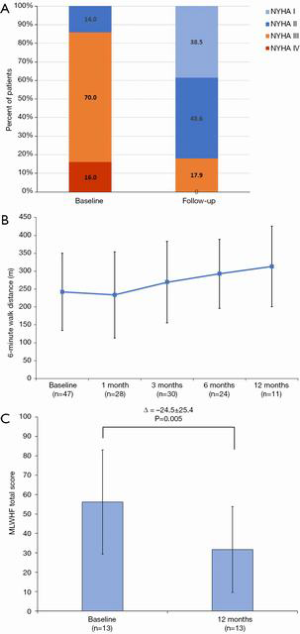 At a median follow-up of 173 (IQR, 54, 342) days, there were four additional deaths after 30 days (between day 54 and 122) but no deaths after 4 months (Figures 3,4); three of these late deaths were due to sudden cardiac arrest and one due to intracranial haemorrhage in the setting of an unwitnessed fall. Overall, the one-year survival rate was 77%. Mild para-prosthetic MR was present in three patients (7.1%), while mild prosthetic MR occurred in eight patients (19.0%) (Figure 5). For the survivors, mild or no symptoms of heart failure (i.e., NYHA functional class I or II) were present in 79% (P<0.0001 vs. baseline), and, for a subset of patients, there were significant improvements in the Minnesota Living with Heart Failure Questionnaire (MLHFQ) scores (56.2±26.8 vs. 31.7±22.1; P=0.011) and six-minute walk distance (Figure 6). Pulmonary artery systolic pressure on transthoracic echocardiography decreased from 46.7±14.7 to 37.2±9.7 mmHg at follow-up (P<0.0001). No valve degeneration occurred and there were no instances of hemolysis, device embolization or thrombosis.