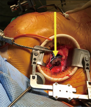 The patient is positioned supine with the right arm above the head. After uneventful transfemoral TAVR, femoral venous and arterial cannulation are used for peripheral cardiopulmonary bypass (CPB). A 5 cm right mini-thoracotomy incision is made in the fourth interspace. The pleura is entered, and pericardium opened above the phrenic nerve. Appropriate pericardial suture placement provides effective diaphragmatic retraction and exposure. Cardioplegic arrest is facilitated by aortic cross-clamping, taking care to place the clamp as high as possible, which is key in TAVR patients to avoid injury to the valve frame. The left atrium is entered via Sondergaard’s groove. A left atrial retractor inserted through a separate incision provides excellent exposure of the mitral valve (Figure 2). One must avoid aggressive retraction in patients with prior TAVR to prevent distortion of the TAVR valve (5).