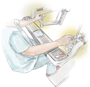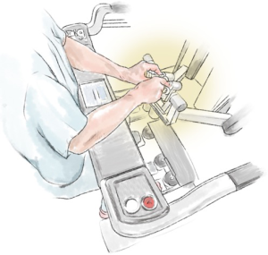The camera should point horizontally with a neutral horizon to prevent disorientation of the surgeon or first assistant. Intentional rotation may temporarily be required to operate or to help find instruments. Different angulation facilitates visualization of different structures at different stages of the operation (Figure 2). Thirty degrees up (30 up) allows visualization of the chest wall, port placement, instrument insertion and removal as well as dissection of the chest wall. Thirty degrees down (30 down) enables vision of the lung, hila and soft tissues. Zooming in with 30 up results in a concave visual arc so the digital zoom may be better. Software options can swap hands when looking caudally such as when dissecting the lung off the diaphragm. Care should be taken to avoid undue impact on the patient. Thirty down may be optimal for the surgical view but can result in a more horizontal arm causing direct pressure or levering in the intercostal space.