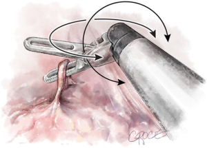 If the technique is anterograde then the artery sheath is breached and 1 cm of tissue either side is cleared to make way for the Cadiere to go around in preparation for the larger stapler, bluntly dissecting in one direction and then at 90 degrees to it (90-90, fig) before a sling is placed. The best port is chosen to allow an endowristed or external stapler to be placed with the most ease, the least angulation and equally the least pressure on adjacent structures. The stapler is placed with no tension on the sling, and gently held in position by the console surgeon before removal of the sling and division. After this the lobe is rolled and held back up to its optimal position as before and the inferior vein divided in the same way. It is sensible when dividing vascular structures to know where the nearest swab is and to have a clamping instrument (Cadiere fenestrated, curved bipolar forceps) proximal to the stapler in case of stapler misfire.