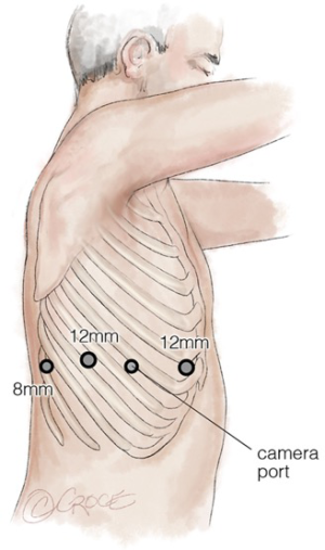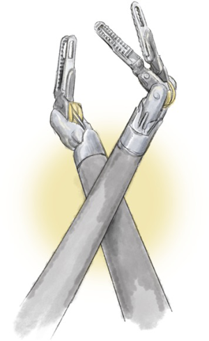 There are four arms to a modern robot with the ability to interchange the camera and the instruments. The 4th arm is most useful when it has an instrument retracting tissue sufficiently to allow the other two arms to operate closely together, eliminating the difficulty of one-handed operation or pushing as required in most standard video-assisted thoracoscopic operations. Picking up the tissue with one hand and cutting or dissecting it, with or without energy, is necessary in robotic surgery as in open surgery. It represents a totally endoscopic procedure through tiny holes with careful dissection on one side and counter-traction on the other, while the larger piece of the organ or tissue is optimally retracted at a distance.