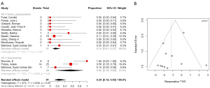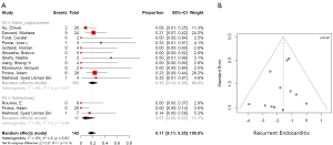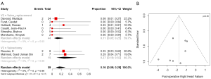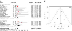 For dichotomous variables, a meta-analysis of proportions with logit transformation was conducted for the available main perioperative and postoperative variables. Continuous data were combined via meta-analysis with random-effects model. Heterogeneity was evaluated using Cochran Q and I2 test. Odds ratio was the utilized effect measure. Subgroup analyses were conducted to compare baseline characteristics and outcomes of patients who underwent tricuspid valvectomy vs. replacement. Egger’s regression test for funnel plot asymmetry was performed to assess for publication bias. All analyses were performed with R software, version 3.5.1 (R Foundation for Statistical Computing, Vienna, Austria). P values <0.05 were considered statistically significant.