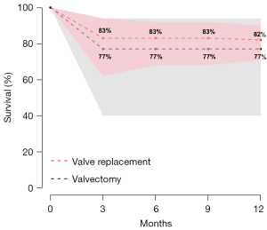 The overall follow-up time for both groups was 50 months [valvectomy, 21 months (95% CI, 0–109 months) vs. replacement 53 months (95% CI, 24–82 months)], with no statistically significant differences in follow-up time between the two groups (P=0.50).