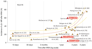 In the late 2000s, Magne et al. compared MV replacement (MVR) versus MVr, both associated with CABG surgery, in ischemic patients (17). Data suggested that MVr was not superior to MVR with regard to operative and overall mortality. Most importantly, this survival equivalence at long-term follow-up (12 years) was found regardless of the MR recurrence rate in the repair group—45% of MVr patients had at least mild MR (Figure 1). Since patients with persistent MR despite MVr had the same survival rate as patients with no recurrent MR, the question of the clinical impact of treating secondary MR was raised. Additional doubts were set forth by large retrospective studies analysing CABG alone versus CABG in conjunction with MVA in ischemic patients who were candidates for CABG surgery. Several studies suggested no clear demonstrable survival benefit conferred by MVA as the poor prognosis was related to the underlying cardiomyopathy rather than to the mitral surgery (21,22). A sudden shock wave passed through the cardiovascular surgery field and it became increasingly questionable if modern surgical strategies could really improve patients’ prognosis when compared to medical therapy alone. Finally, most of the publications that shaped recommendations (even the current ones) were single-centre, retrospective studies including small populations with heterogeneous patients (primary and secondary MR, ischemic and non-ischemic secondary MR, broad inclusion criteria regardless of selection on LV dimensions). Moreover, most studies reported the retrospective results of a single treatment (surgery) with no control group. Thus, “evidence based medicine” had not yet reached the surgical world.