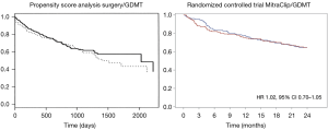 In August 2018, the results of the MITRA.FR randomized controlled trial were presented, comparing a group receiving GDMT versus a group of MitraClip + GDMT in a population of heart failure patients with secondary MR (19). The study showed an absence of benefit in the primary endpoint (death from any cause or rehospitalisation for heart failure) and in any sub-group analysis. These results were in total accordance with all previous literature and, in particular, when we compared the curve of MITRA.FR with the propensity matched series of Wu et al. (15) (Figure 2).