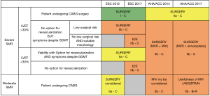 - Candidates for CABG with severe secondary MR: a randomized study was performed in the US by the Cardiothoracic Surgical Trials Network (CTSN) to compare MVr and MVR over a 12-month follow-up period (18). The authors found no significant difference in LV end-systolic volume index (LVESVI), remodelling or survival between both groups. Two other major takeaways were also identified: (I) the composite major adverse event (rate of death, stroke, subsequent MV surgery, hospitalization for heart failure or an increase in New York Heart Association class of ≥1) occurred in up to 30% of patients at 1-year follow-up, highlighting the large potential for improvement in the therapy of ischemic secondary MR; and (II) the investigators found a MR recurrence (≥ grade 2) rate at 2 years of 60% after MVr. Thus, if the persistence of MR had no impact on the survival, the usefulness of treating secondary MR would be challenged. In the subgroup of CABG surgery candidates with severe ischemic MR, no prospective study compared CABG surgery with MR correction versus CABG surgery without MR correction for understandable ethical reasons.