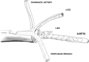 Further advancements include the development of novel FET prostheses incorporating endovascular side branches specifically for the left subclavian artery (LSA), aiming to streamline total arch replacement by facilitating its connection. One such innovative prosthesis features an endovascular side branch for LSA connection, designed to enhance the efficiency of aortic arch replacement (Figure 1). Pre-clinical testing in a human cadaver model demonstrated the feasibility of accurate deployment with anatomical orientation towards the LSA ostium, followed by successful stent graft deployment (Figure 2) (27). Proximalizing the distal anastomosis to zone 1 simplified the procedure and facilitated its completion. First-in-men experience with this novel FET prosthesis with conditions such as penetrating ulcer, non-A non-B aortic dissection and chronic arch aneurysm showed promising preliminary clinical outcomes (28). Surgeries were performed under high moderate hypothermia (27 °C), employing bilateral selective antegrade cerebral perfusion and distal aortic perfusion. Anastomosis of the FET prosthesis with the aortic arch occurred in zone 1, followed by separate reimplantation of the left common carotid artery and the brachiocephalic artery.
