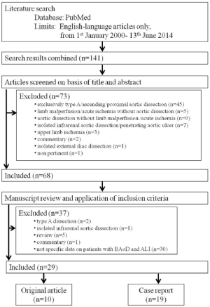 The PubMed database was systematically searched from 1st January 2000 to 13th June 2014 for English-language publications reporting on TBAD complicated by acute limb ischemia or LLM. Search terms were “acute limb ischemia and aortic dissection” or “limb malperfusion and aortic dissection”. The reference lists of retrieved articles were also scanned to further identify potentially relevant studies. The search method and results have been reported according to the PRISMA statement (13).