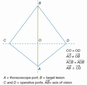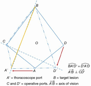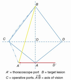 ) is perpendicular to the operation port axis CD and follows the natural longitudinal axis of the patient from the feet towards the head. Nevertheless, this setting fails to reproduce the real-life arrangement where the surgeons and assistants are situated around the operating table. In real settings, many surgeons stand anterior to the patient in the lateral decubitus position. Consequently, the real axis of the operation is translated posteriorly (Figure 2). The posterior port (D) is translated along the viewing axis and the surgeon is too far to comfortably handle the instrumentation from their position. In addition, if the assistant stands on the opposite side of the operating table, the visual axis would be completely different. In order to cope with these technical and ergonomic challenges, the three-port VATS port placement strategy has been modified, as proposed by Henrik Hansen and coworkers, with the translation of the trapezoid (Figure 3) (7). The camera port (A) has been brought more anterior to the anterior axillary line (A') and the posterior port (D) has been placed more caudally (D'). The utility port position (C) remains unchanged. Although the trapezoid has been preserved, the axis A'B is more comfortable for the operating surgeon. The assistant stands on the same side of the operating table thus improving coordination. After further experience with the three-port VATS approach, it was realized that the posterior 3 mm (D') port was not always essential, resulting in a two-port VATS technique (Figure 4) (8). The three-port approach, whereby the trapezoid configuration allows maximal convergence of operative instruments from each side of the target lesion, results in interference with the optical source (3). The uniportal approach requires translation of the thoracoscope and instruments 90° along a sagittal plane passing from point C, allowing the operative instruments to target the lesion from a vertical and caudo-cranial perspective (Figure 5). To avoid mutual interference, the use of articulating instruments is of paramount importance for their ability to rotate the stem and jaws independently on different planes and with multiple angles. In fact, the approach to the target lesion in the lung is substantially similar to the approach that the surgeon would use in open surgery (9). In the uniportal VATS approach, the target lesion is located in a projective plane with homogeneous coordinates. It is elevated with forceps perpendicularly from the parenchymal profile and resected by applying a stapler (or a curved clamp and overseen) at the base of this newly formed, cone-shaped parenchymal area (10). The approach for a target lung lesion is then similar to a coaxial approach: surgeons work with their eyes and hands in the same plane (coaxial approach), much like open surgery and in contrast to three-port VATS (para-axial approach) (11).